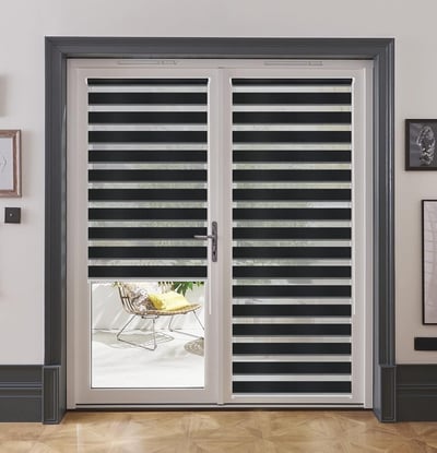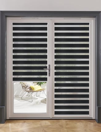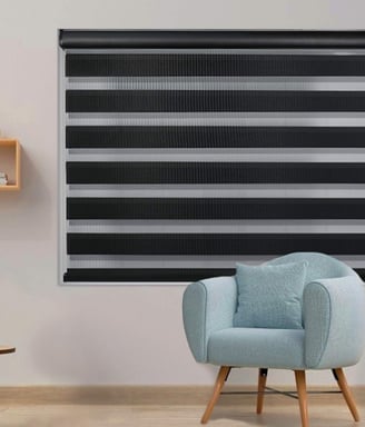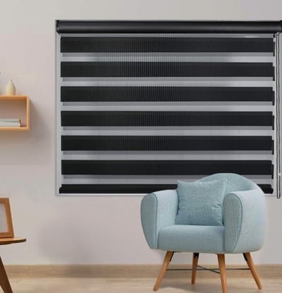 Achieve a modern look with zebra blinds, featuring alternating sheer and solid panels for customizable light filtering.